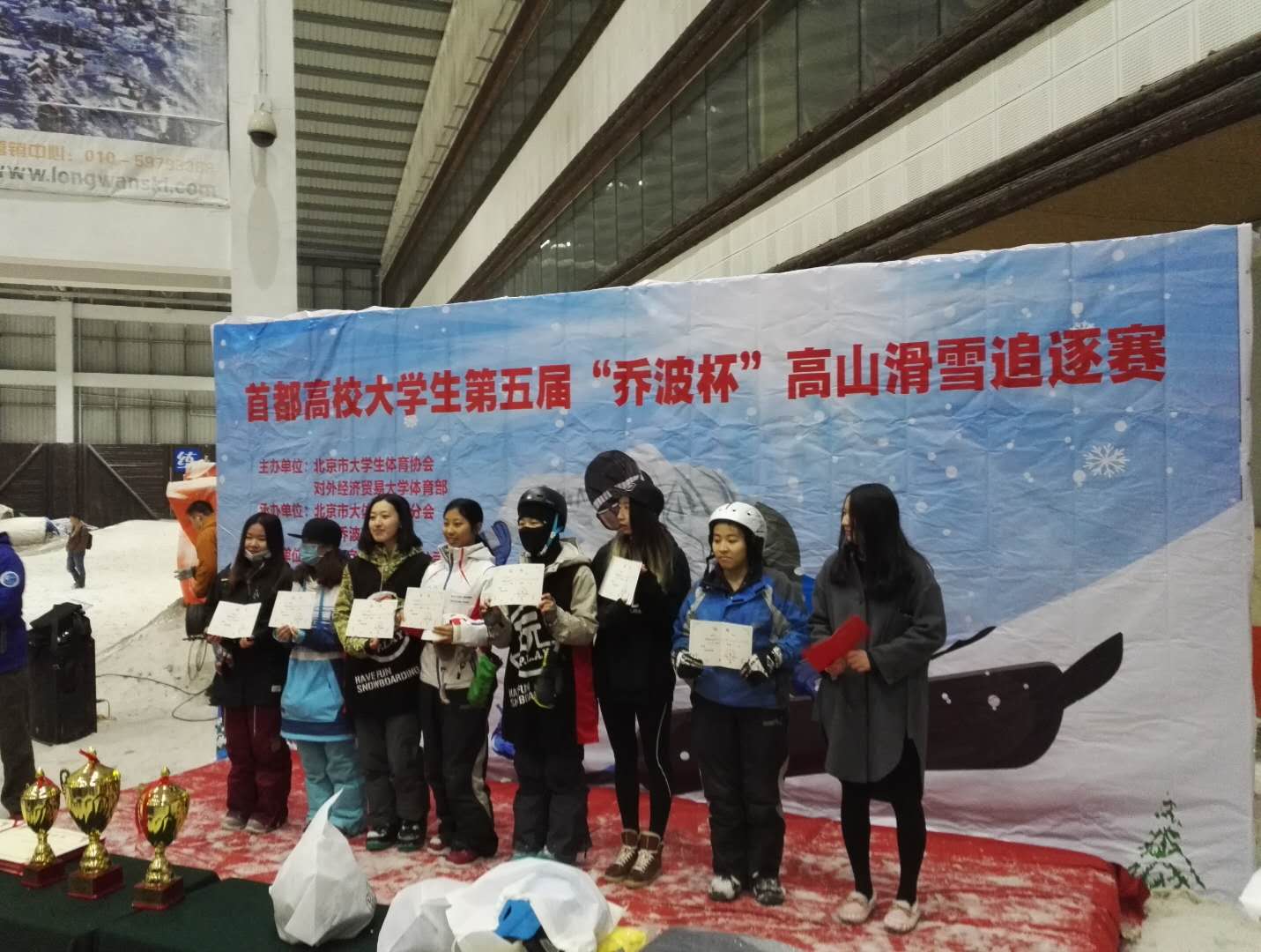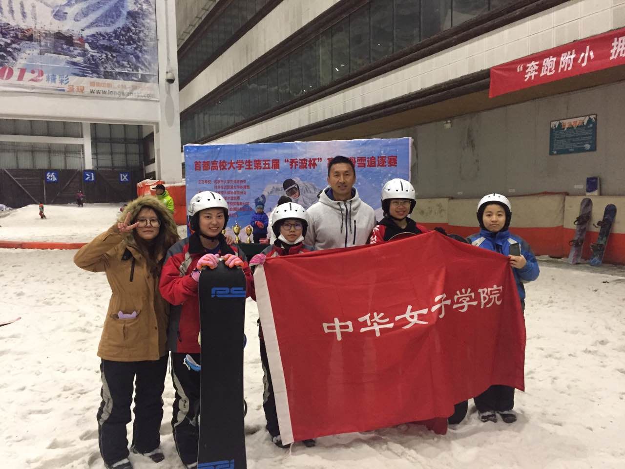 为迎接北京冬奥会、响应国家三亿人参与冰雪运动的号召,进一步推动滑雪运动在首都高校的普及和发展。2017年11月5日,首都高校第五届高山滑雪追逐赛在顺义乔波室内滑雪馆举行。来自北京25所高等院校的代表队共80余名运动员参加了比赛。本次活动由北京市大学生体育协会、中国滑雪协会主办,北京市大学生体育协会滑雪分会、乔波滑雪世界承办。我校共派出方丽平、陈海燕、尹彩菊、肖鳗云、刘美云五名女同学参加了女子单板个人追逐的比赛,经过上下午四个轮次的激烈角逐,最终,方丽平同学获得了女子单板比赛的第六名的好成绩,我院滑雪队获最佳精神文明奖。