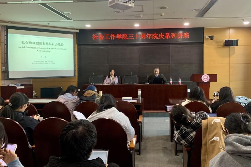 刘能教授首先系统地梳理了基层地区与社会治理含义的历史变迁:通过对古代封建时期、封建帝制时期、近代化和当代时期,中国在社会治理方面的探索和实践的梳理,力图在中国传统社会的政治、经济、土地、人口等制度中寻求社会治理经验,以进行本土化的社会治理研究与实践。刘能教授特别强调了历史传统对社会研究的借鉴意义。随后,刘能教授通过对社会治理与社会管理这两个概念的比较分析,阐明了社会治理的概念,并着重解析了现代性和社会问题、风险社会和福利生产、三大部门的合作这三大社会治理的理论语境。基于此,刘能教授依据自己的实践调查向大家分享了社会治理经验场域的强、中、低三类控制型案例。最后,刘能教授指出基层社会建设的两个方向为信息化建设和社会组织的培育,并鼓励有志从事社会工作实务和研究的同学,对此进行科研和实践的探索。