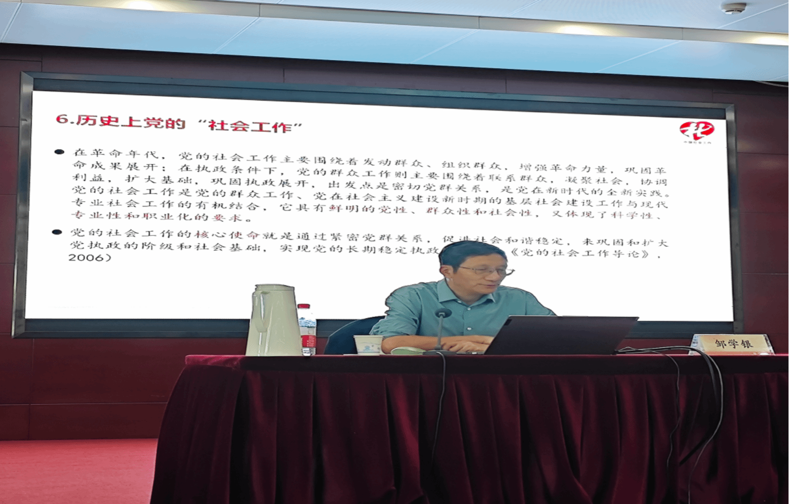 邹教授主要从三个方面为同学们进行了深入的阐述。在“社会工作者队伍建设的新格局”部分,邹教授以党的二十届二中全会审议通过的《党和国家机构改革方案》和党的二十届三中全会“健全社会治理体系”中关于社会工作的论述为政策背景,为同学们讲解了中央社会工作部的组织结构和职能设置,提醒大家高度认识中央社会工作部在负责统筹指导人民信访工作、人民建议征集工作、推进党建引领基层治理和基层政权建设等方面的重要地位。指出了我国社会工作者队伍建设的新格局。在“加强社会工作者队伍建设的新定位”部分,邹教授帮助同学们澄清了日常生活、社会服务、学科历史、专业建设、职业概念、党的建设等不同语境下的“社会工作”内涵,强调中央社会工作部成立后,党的社会工作者队伍的新定位为通过推动党的政治工作和群众工作的科学化,巩固党的执政基础,提高党的执政能力,服务党的社会工作事业。在“社会工作者建设的新任务”部分,邹教授指出在新格局下,社会工作者队伍建设需要做到坚持为党育才、坚持专业化发展、坚持职业化发展、坚持本土化发展、坚持现代化发展,由探索发展向内涵式发展迈进,由扩面增量到提质增效转变,不断优化人才结构,大力提升人才的量与质,让社会工作者在实现中国式现代化中发挥更加积极的功能。最后,邹教授总结到,新格局下的社会工作者队伍建设,应建立“组织部门牵头、社工部门统筹、使用部门推进、有关部门保障、现代科技赋能”的工作格局,做好政策制度顶层设计,围绕“培养、评价、使用、激励”等关键环节提质增效,既要做好“纵向”一脉相承,也要做好“横向”有效衔接,发挥最大合力,不断推动社会工作者队伍建设迈向高质量发展的新阶段。