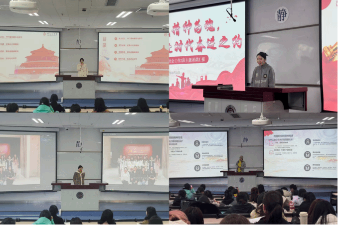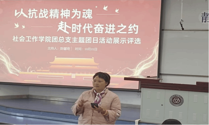 展示评比现场,各班团支部用创意与行动汇报了形式新颖多样、内容丰富多彩的团日活动,成果精彩呈现:2025级社会工作妇女服务团支部全体同学进行了《烽火巾帼志,青春接力行》主题诗朗诵,2024级社会工作2班团支部带来《红烛照血,青史承魂》主题集体朗诵,2024级社会学1班团支部推出《数字人穿越对话》创意展示,23级、24级的团支部通过主题宣讲、特色作品展演等方式,生动诠释抗战精神内涵,充分展现支部协作力与青年创意。