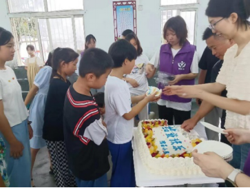 在关爱陪伴服务的最后一天,豫苗小队组织李桥镇的小学生们举办了一次汇报演出,邀请中华女子学院新蔡留守儿童关爱团领导、李桥镇妇联领导、李桥镇中心小学校长和学生家长共同参与。汇报演出伊始,社会工作学院分工会向李桥镇中心小学的师生捐赠了图书。在演出中,豫苗小队师生和小学生们献上了合唱、诗朗诵、舞蹈、阅读分享和情景剧等内容丰富、意义隽永的节目。最后,豫苗小队师生为大家准备的祝福蛋糕亮相了,大家在欢声笑语中共品佳肴,并合影留念,为汇报演出画上了圆满的句号。