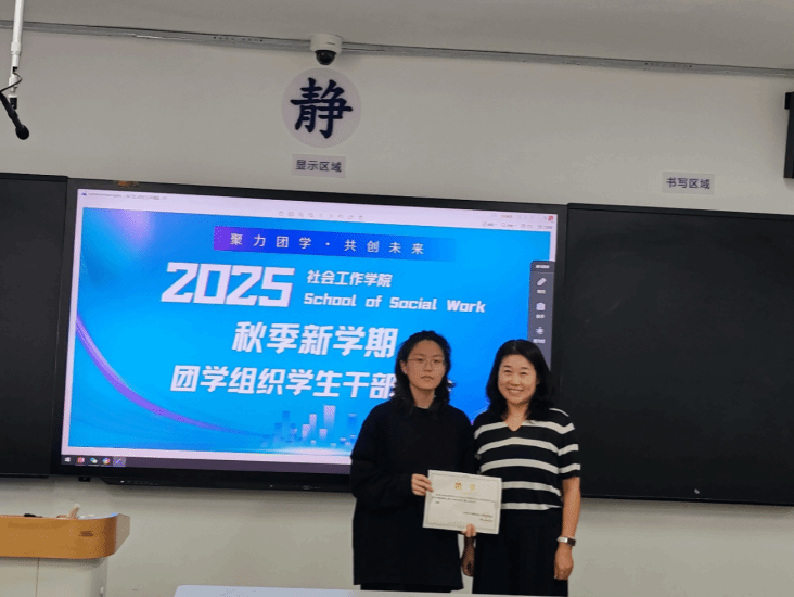 为加强新一届团学组织团队建设,新学期团学工作更有成效地开展,社会工作学院于9月16日举行了2025年秋季新学期团学组织学生干部大会。会议由学院团总支书记兼辅导员郭雪莲主持,并为补选的执行主席秦锐颁发聘书。