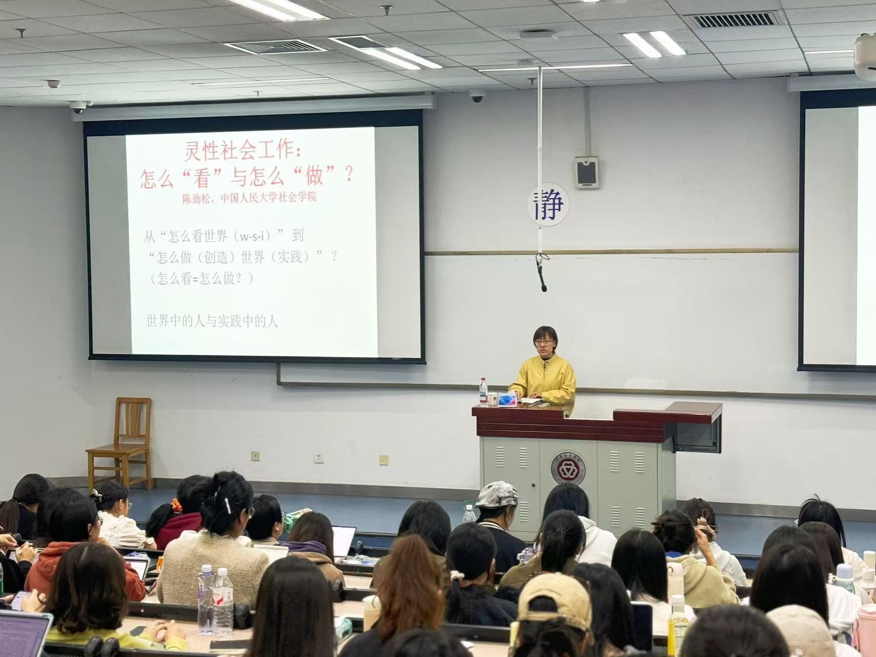 郝彩虹首先代表学院对陈劲松教授的到来表示热烈欢迎。她指出,陈教授长期深耕社会工作本土化与灵性社会工作研究,其学术洞见与实践经验对拓展师生的理论视野具有重要意义。她鼓励同学们珍惜此次学习机会,深入体会灵性社会工作的学理内涵与现实价值。