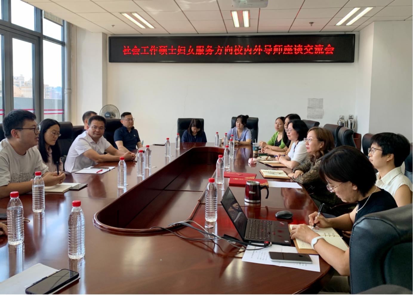 校内外导师座谈会于9月12日13:00-15:00在教图楼第四会议室举行。此次座谈会采取了线上线下相结合的方式,妇女服务方向的全体校内导师和校外导师张跃豪、马现爱、刘乐璇、乔踔等线下出席了会议,校外导师梁肖月、张秀静、王科等在线上参与了本次交流会。社会工作学院副院长郝彩虹主持会议。