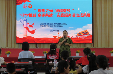 7月12日上午,暑期实践团组织了实践服务活动成果展示。乃则尔巴格镇副镇长阿尼古力·拜克热、乃镇前进村第一书记兼工作队队长比里克孜·依明、工作队副队长王东哲、金鑫以及儿童家长等莅临现场。比里克孜·依明书记对中华女子学院师生的辛苦付出表达了诚挚感谢,强调正是因为师生的努力,为当地儿童带来了积极改变。希望前进村儿童珍惜时光,好好学习,努力成为有理想、有本领、有担当的新时代人才,为家乡的发展贡献自己的力量。阿尼古力·拜克热副镇长在讲话中对中华女子学院师生的奉献表示感激,指出儿童是家乡的未来和希望,要以女院师生为榜样,勤奋学习,不断进步。李敏院长新疆维吾尔自治区妇联工作队的大力支持表示感谢,并表达了后续将发挥学校学院的学科优势和资源优势,进一步加强与自治区妇联的合作,为新疆妇女儿童发展贡献力量的愿望。令人感动的是,儿童家长为了表达对老师们的感谢,特意采摘了自家种植的杏子作为礼物送给实践团。
