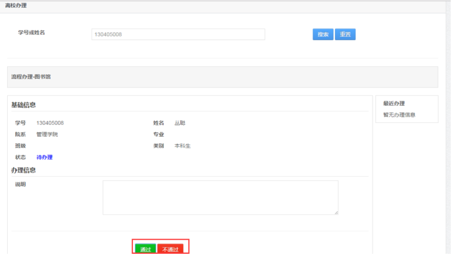 2、输入学生学号或姓名查询到学生信息,点击通过或不通过进行办理。