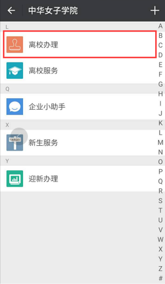 1、进入中华女子学院企业号,点击“离校办理”功能,选择输入办理。