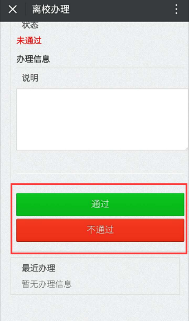核对学生信息后,点击下方的【通过】或【不通过】按钮进行办理。
