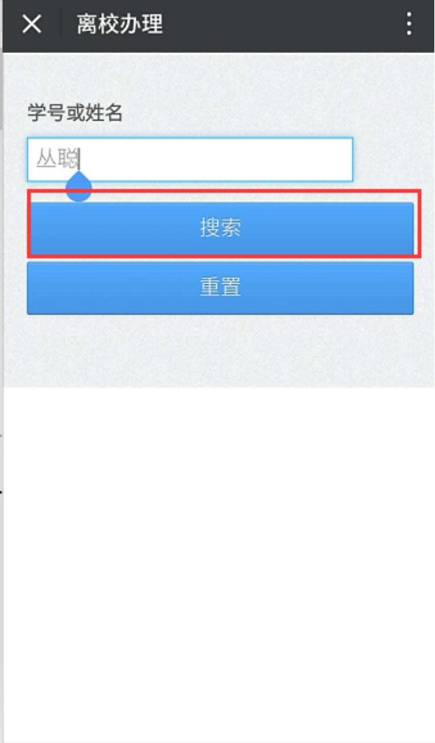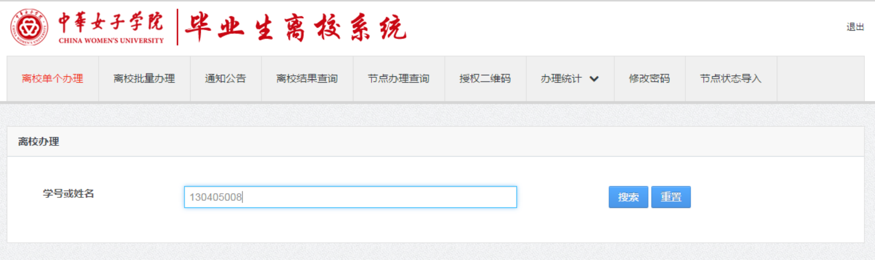 在离校单个办理页面输入办理学生的学号或姓名进行回车或者点击搜索按钮。
