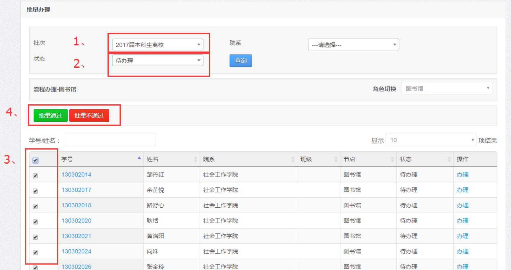 注意:批量办理时不同状态的学生不能一起进行批量办理(会出现没有勾选框的情况);批量办理功能不能办理状态为“无需办理”的学生。