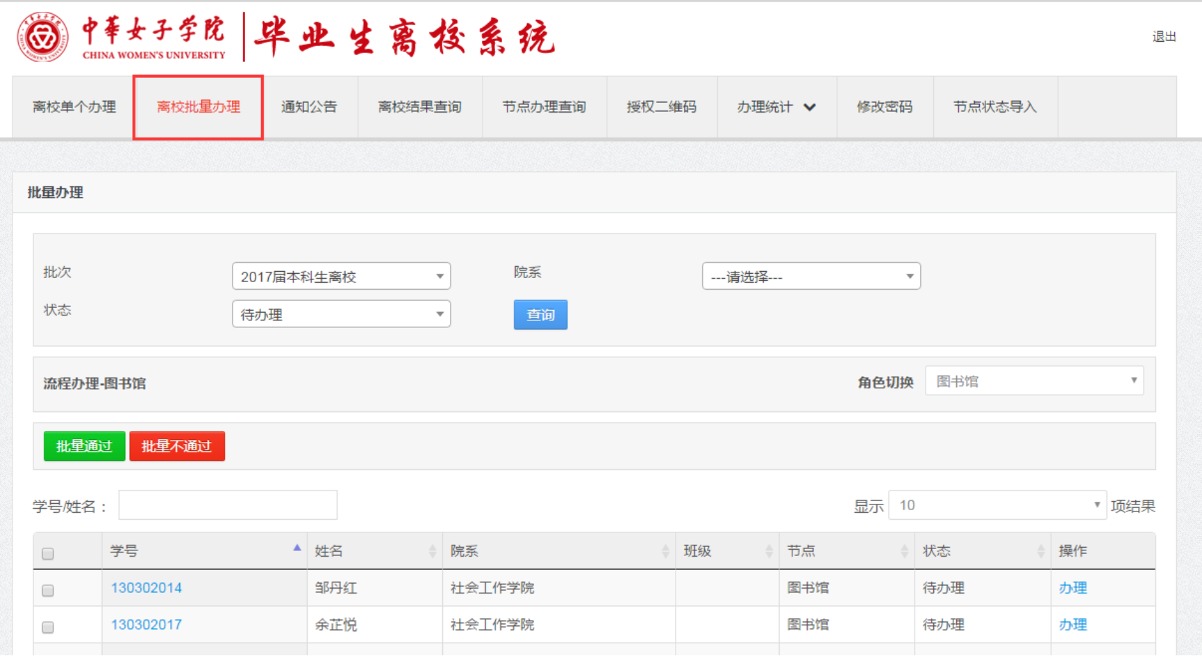 各部门负责离校系统办理的操作人员,通过系统提供的【离校单个办理】和【离校批量办理】功能进行离校业务办理。