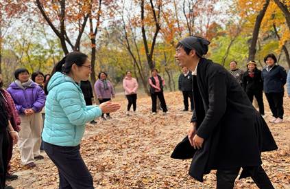 本次活动由爱因思心理公司的专业艺术疗愈老师带领,参与人员通过戏剧雕塑游戏、表达类游戏、小组分享等方式连接自己的身体,疏解和释放情绪,获得压力疏导。老师用一个眼神互动表达交流的游戏开始,让大家彼此拉进距离、放下戒备,全身心的投入活动中。接下来的雕塑游戏和情景剧创作表演把活动推向高潮,大家的欢声笑语营造出秋日温暖氛围,在光与影的交互里,每个人都沉浸在游戏的欢乐中,全身心的投入,忘记了自己的烦恼与压力,跟着老师的节奏融入自然、释放自我。