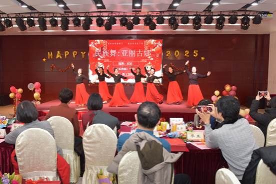 联欢会现场气氛热烈如火。在熟悉欢快的《新年快乐》旋律中,教工文体协会快乐减脂团成员活力登场,她们脸上洋溢着喜悦,步伐灵动矫健,和着音乐节奏,奏响新年序章。