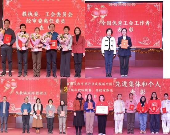 赵浩主席总结了工会今年重点工作并为教执委、工会委员会和经审委离任委员颁奖。邢慧丽副书记、叶水平常委为全国优秀工会工作者和2024年从教满30年教职工颁奖。工会专兼职副主席陈丽君、张小红为中直机关歌咏比赛和高校瑜伽比赛获奖代表以及优秀文体社团颁奖。