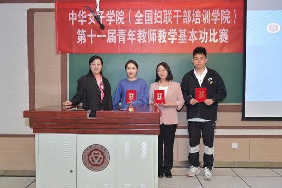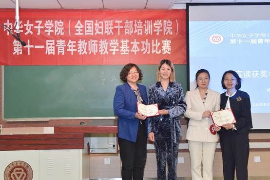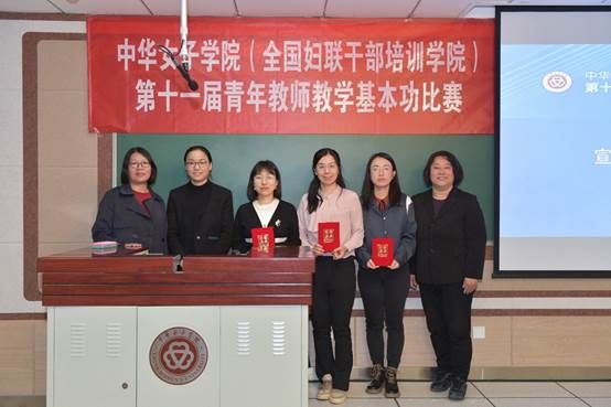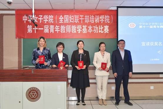 薛小丽、周应江与丁新娅、工会常务副主席张瑞芝、教务部副部长徐海燕、陈丽君一起为获奖选手颁发证书。