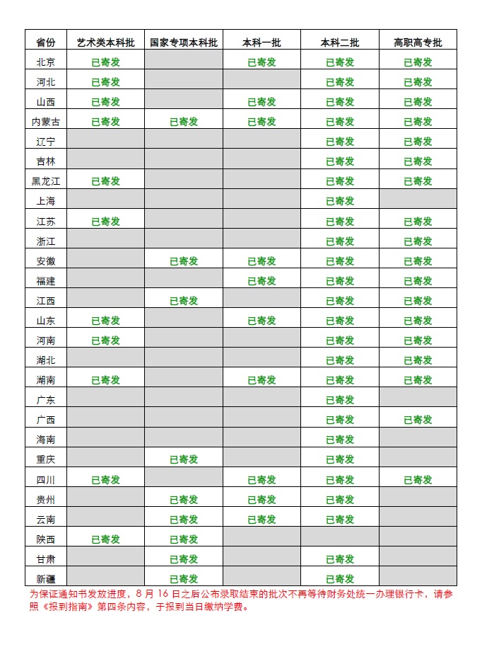 为保证通知书发放进度,8月16日之后公布录取结束的批次不再等待财务处统一办理银行卡,请参照《报到指南》第四条内容,于报到当日缴纳学费。