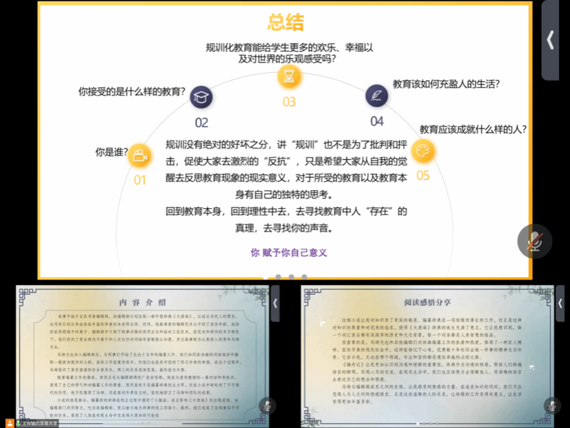 社会工作专业的王梓毓同学分享了《编舟记》的阅读心得,她强调了对知识的敬畏和文化传承的重要性,以及在快节奏社会中坚持和专注的价值。学前教育的李喆同学深入剖析了《规训与惩罚》中社会规训机制对个体和群体的影响,探讨了教育对象的本位回归,引发同学们对教育主体的深刻反思。