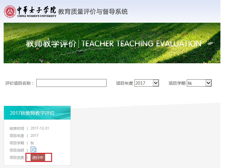 点击页面下方“教师教学评价”图标,打开教师教学评价页面,可以看到页面左下角正在进行中的调查项目。点击“进行中”,打开待评课程和教师列表,点击课程名称旁边的小笔图标,可打开评价页面完成该教师的评价,页面如下图所示。
